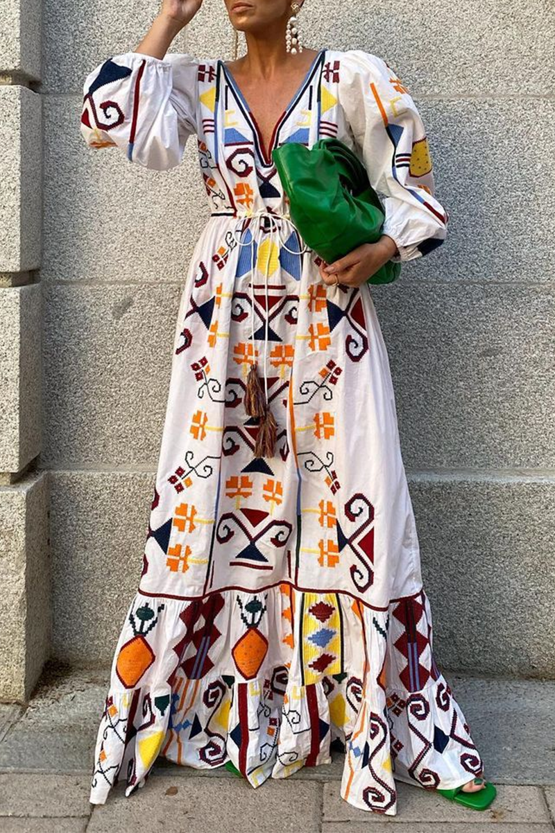 Fashion Elegant Print Draw String Frenulum V Neck A Line Dresses