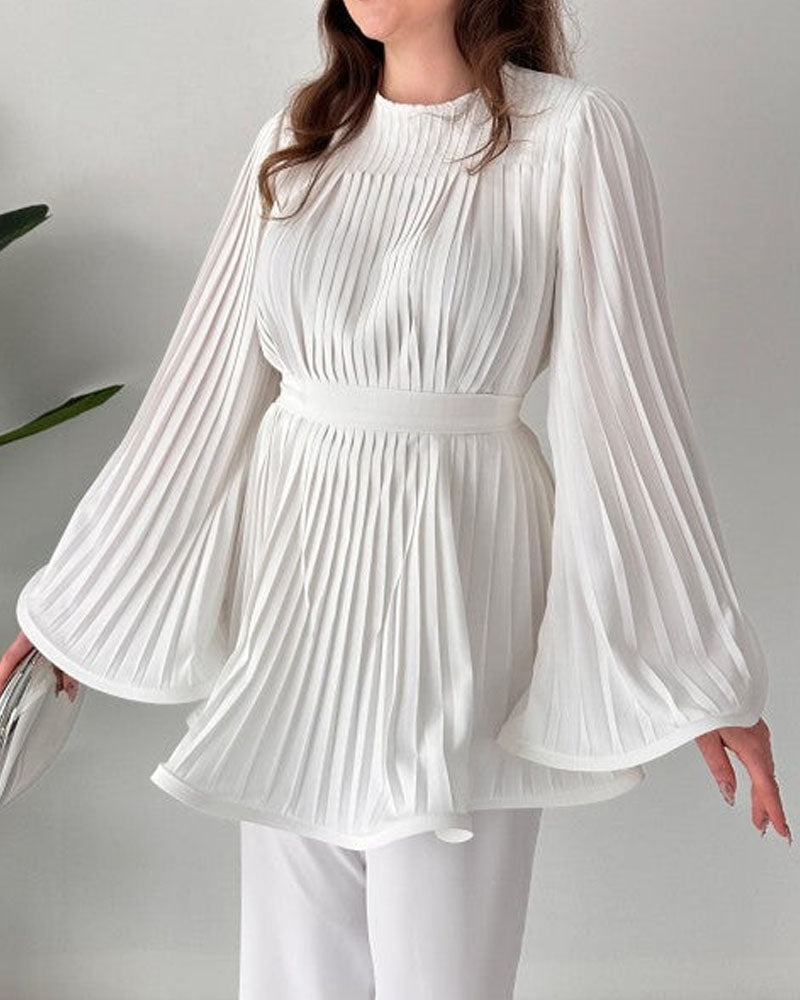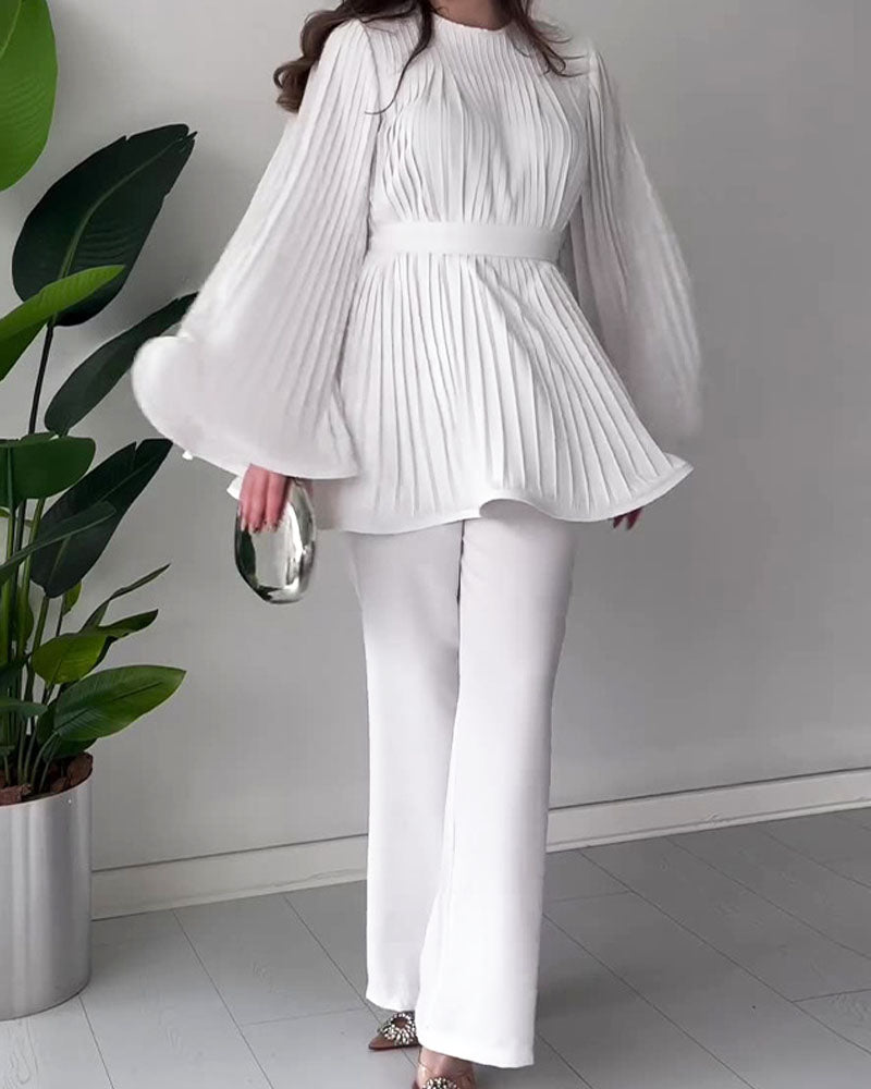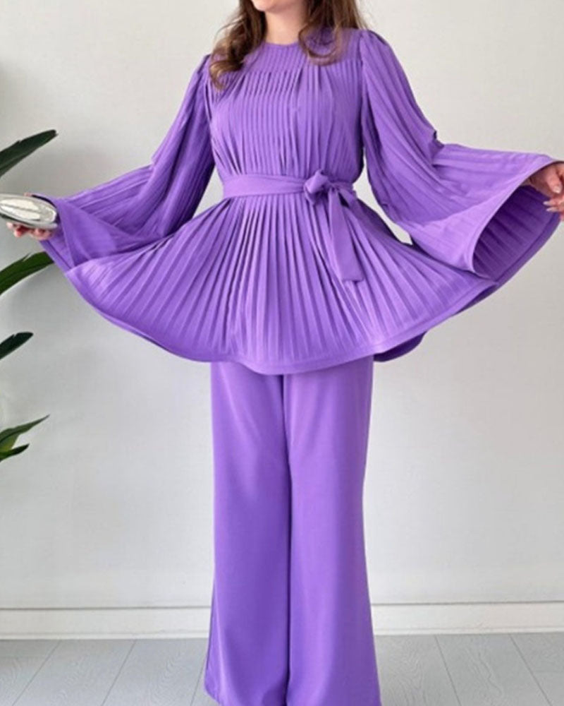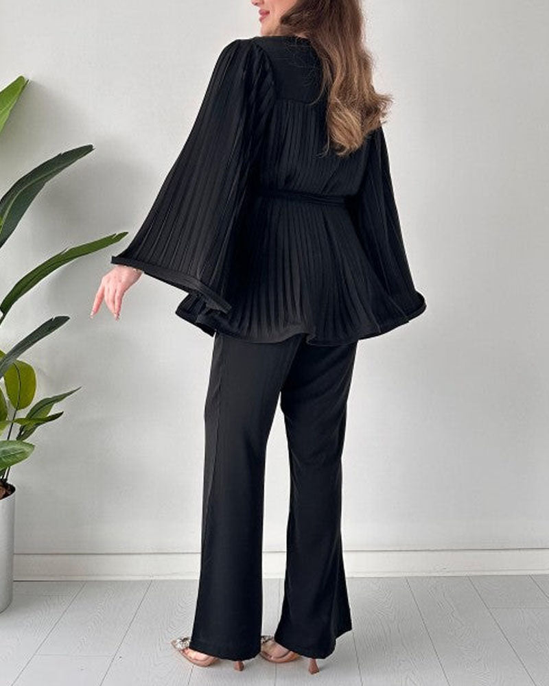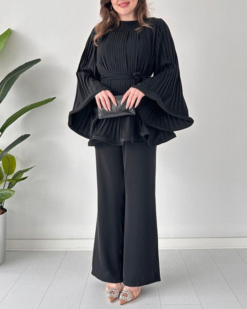 Fashion Round Neck Bat Sleeve Pleated Large Swing Top Suit