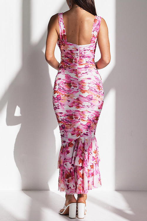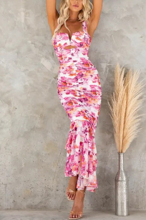 Cut Out Mesh Overlay Floral Print Ruffle Midi Cami Dress