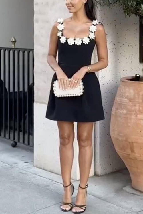 Indulge in your love for florals with our Strappy Floral Neckline Sleeveless Mini Dress. The delicate straps and charming neckline add a touch of femininity, while the mini length shows off your legs. Perfect for a sunny day out or a romantic date night.