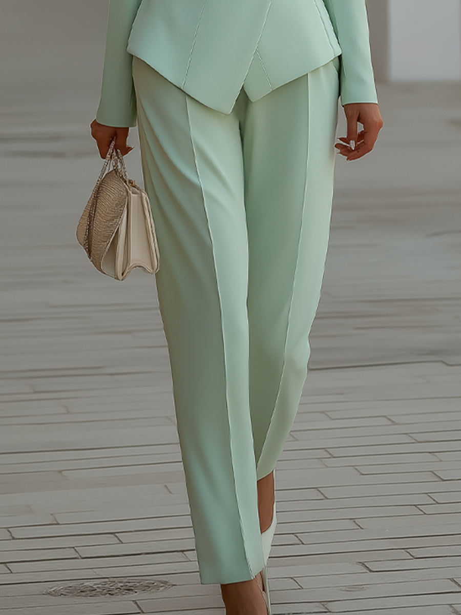 This refined mint suit set offers a fresh interpretation of modern tailoring, blending clean structure with effortless elegance. Designed for confident, style-conscious women, the set features a sharply tailored blazer paired with coordinating straight-leg trousers for a cohesive, polished look. The blazer is crafted with a deep V lapel neckline and a sculpted waist, enhanced by asymmetric button detailing that subtly draws the eye and flatters the silhouette.