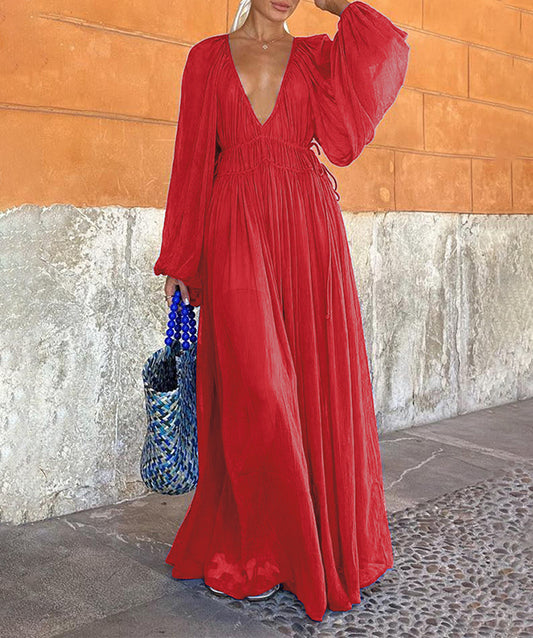 Vestidos elegantes de festa com retalhos de cor sólida com decote em V e saia de cintura