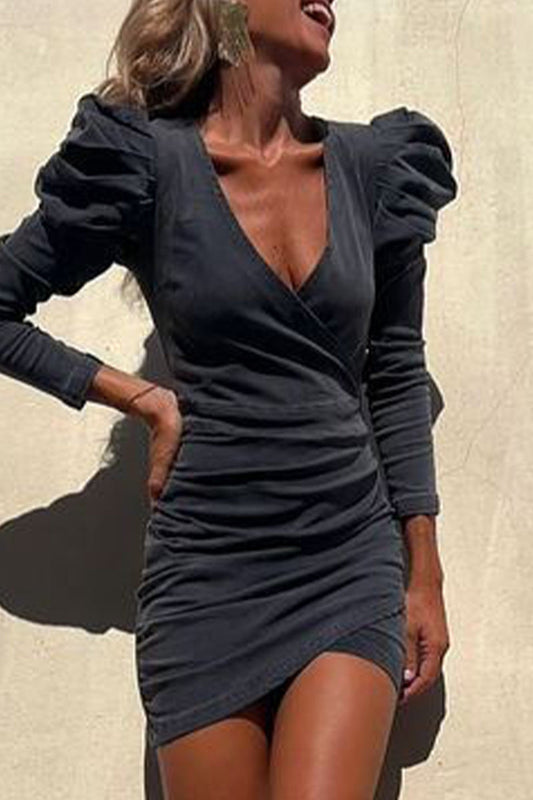 Sexy simplicidade sólida dobra assimétrica decote em v manga comprida vestidos jeans regulares