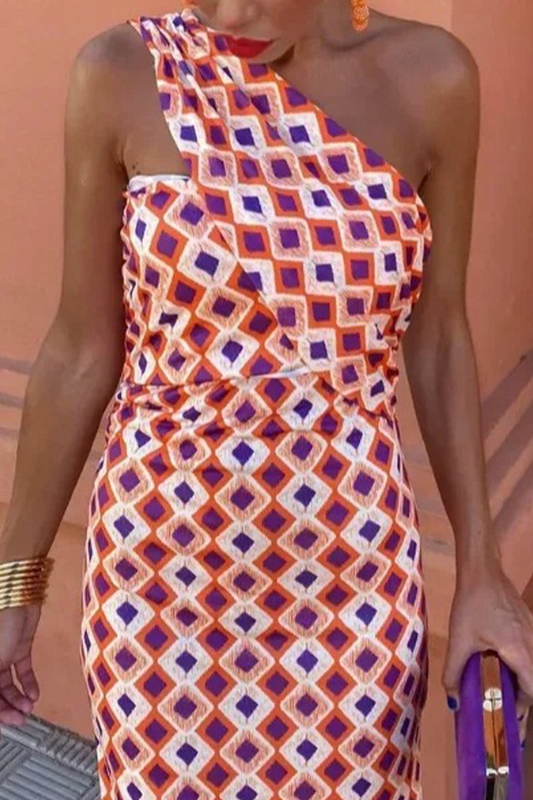 Vestidos sem mangas com gola oblíqua e contraste irregular com estampa geométrica de celebridades sexy