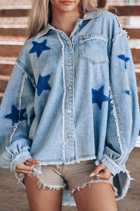 Casual Street The stars Distressed Patchwork Turndown Collar Long Sleeve Loose Denim Jacket
