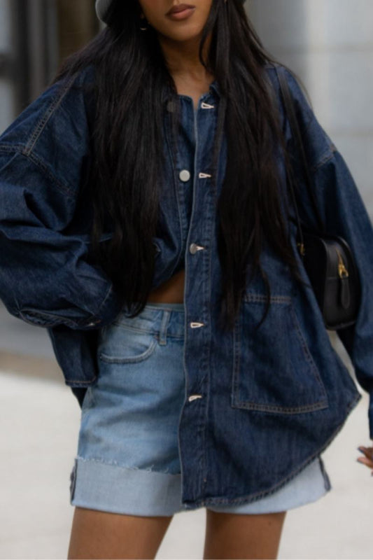 Casual Daily Solid Color Buttons Patchwork Turn-back Collar Long Sleeve Loose Denim Jacket