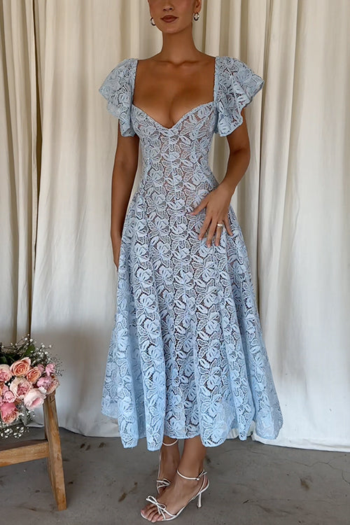 Midikleid mit V-Ausschnitt, ausgestellten Ärmeln und Blumenspitze