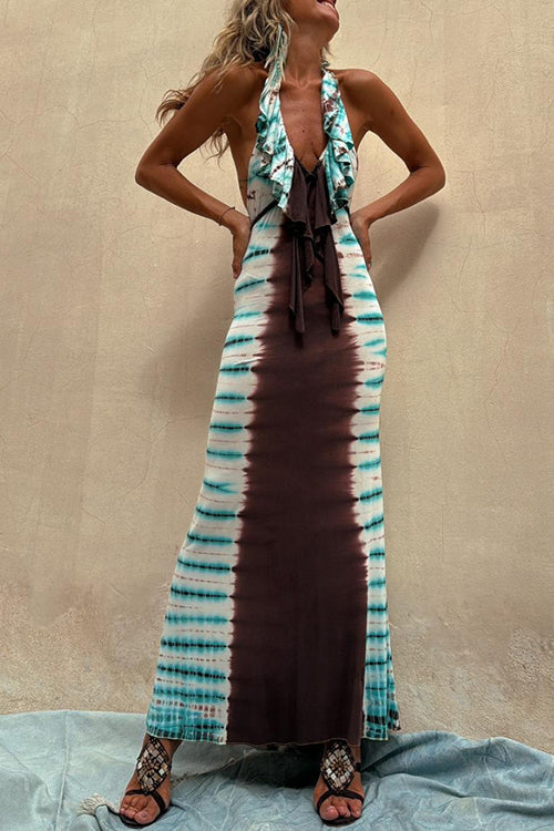 Neckholder-Maxikleid mit rückenfreiem Rüschenbesatz, Farbblock und Batikmuster