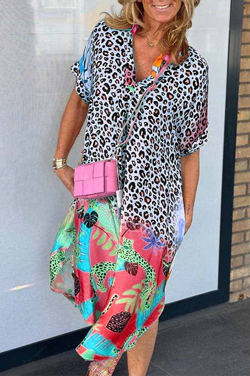 Robe mi-longue à manches courtes et fentes latérales à imprimé léopard