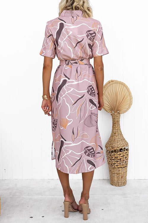 Vestido midi estampado com manga curta e fenda lateral na cintura