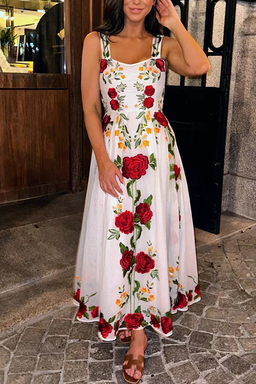 Robe mi-longue trapèze taille haute sans manches à imprimé roses