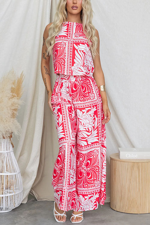 Ensemble imprimé haut court sans manches et pantalon large à taille élastique