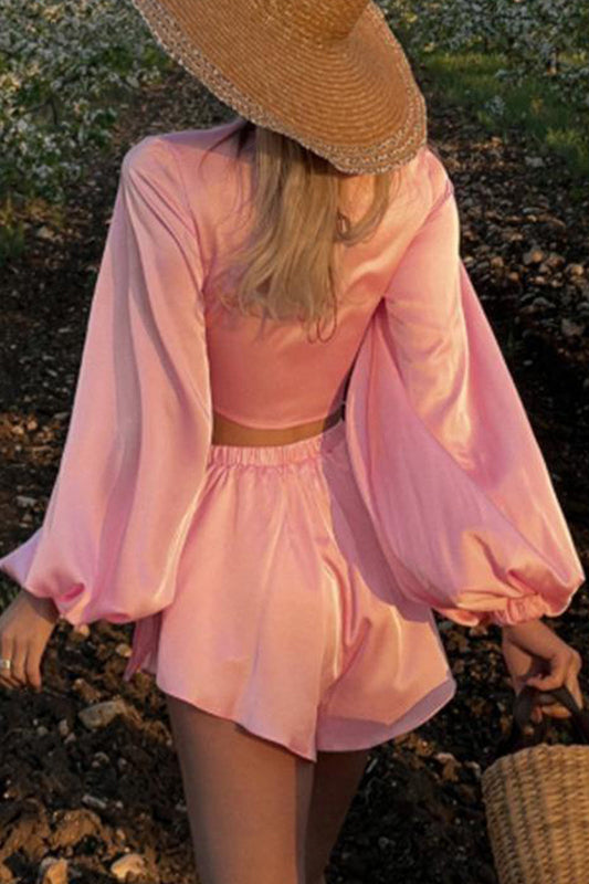 Bandagem sexy sólida com decote em V manga comprida duas peças