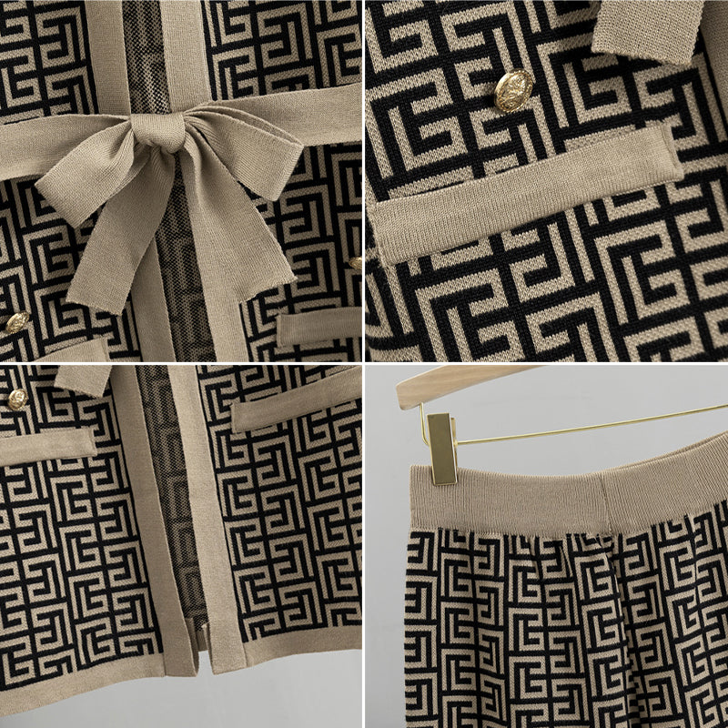 The Co-Ord Knit Set by Valentina Rossi combines high-end sophistication with effortless comfort. This three-piece ensemble includes high-waist wide-leg pants, a V-neck sleeveless top, and a cardigan adorned with front pockets and a belt. The bold geometric pattern adds a contemporary edge to the classic silhouette.