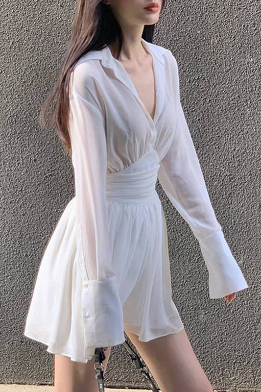 Vestidos de saia de cintura com gola aberta e fivela sólida elegante e doce