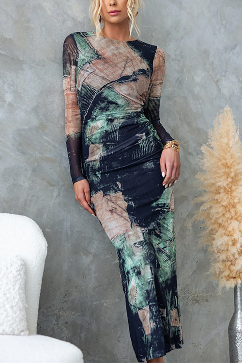 Vestido maxi bodycon chique com estampa abstrata de mangas compridas